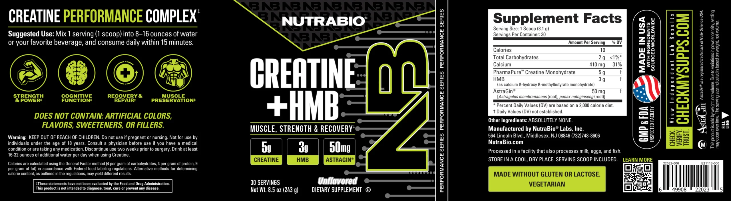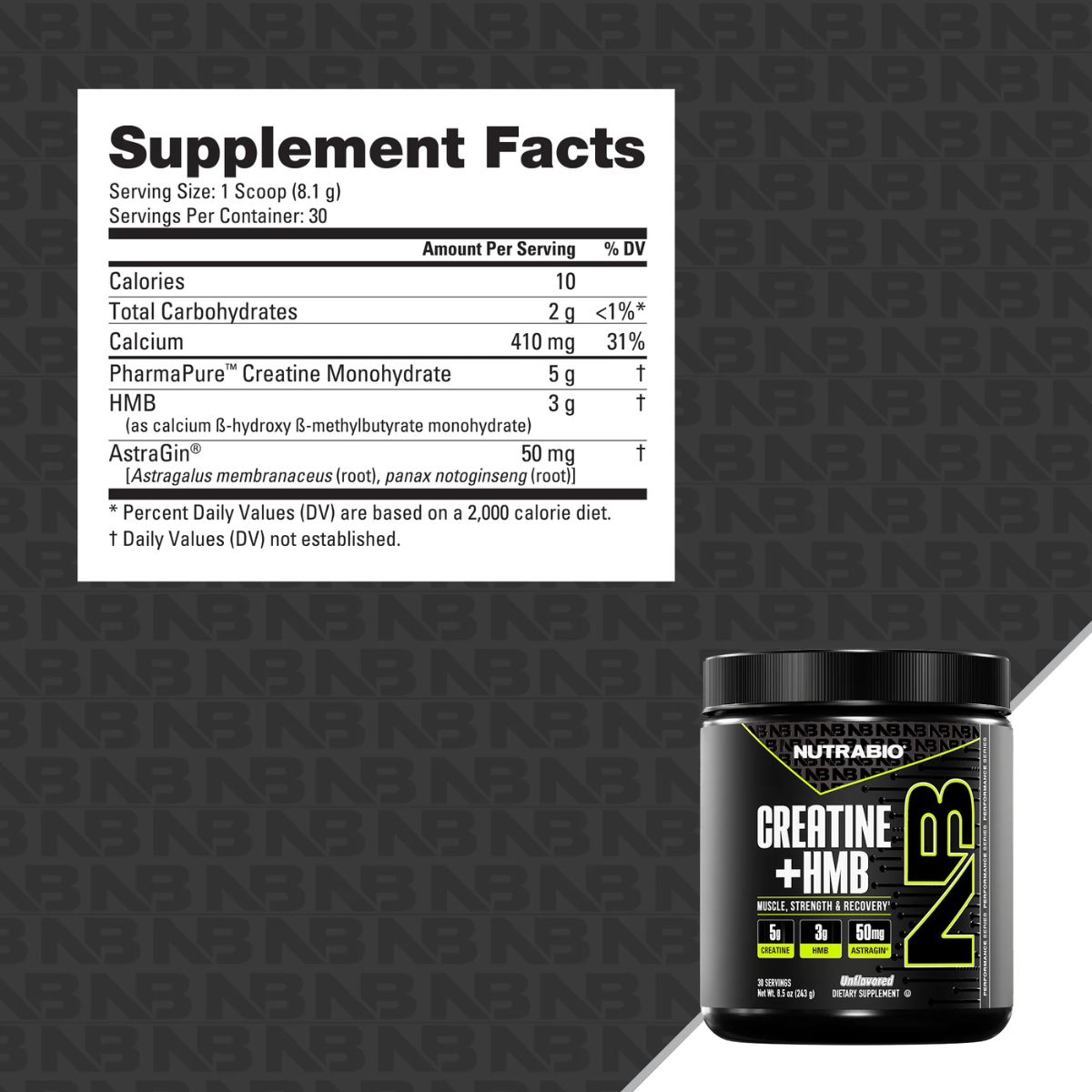 | NutraBio Creatine + HMB ✅ | 5 g | 3 g | AstraGin® 50 mg ✅ | Fórmula limpia; 30 porciones; sin sabor. |